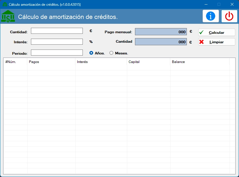 Sencillo programa para el cálculo de amortización de créditos, en el que se muestra el desglose mensual de los pagos, interés, capital y el balance en cada periodo.