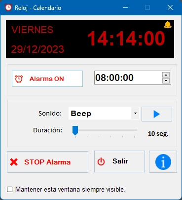 Aplicación con un reloj digital con alarma, puedes seleccionar varios parámetros, como la duración de la alarma o el tipo de sonido.