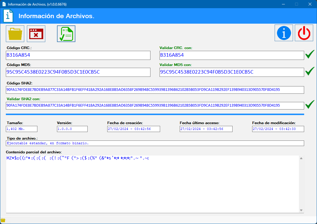 Con esta aplicación podrás verificar la integridad de los archivos (HASH), con algoritmos SHA2, MD5, CRC además de información adicional, sobre el tipo de archivo, fechas de acceso y una muestra de texto, del contenido del mismo.